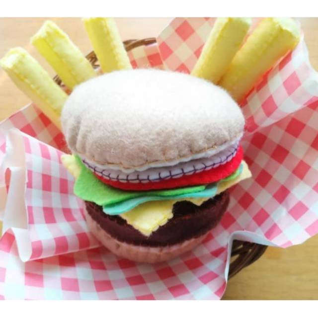 Burger isi roti bun, telor ceplok, daun salada, patty Burger, keju dan tomat, kentang goreng 6pcs