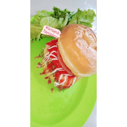 Roti burger berisi daging beef 2 buah,sayuran seperti selada,dan timun dimakan dengan disertakan saus tomat, saus sambal, dan mayonaise