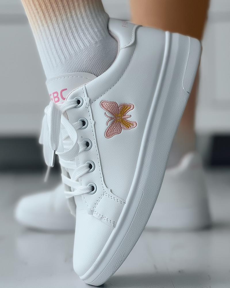 Butterfly Pattern Lace-up Sneakers, Pink&white