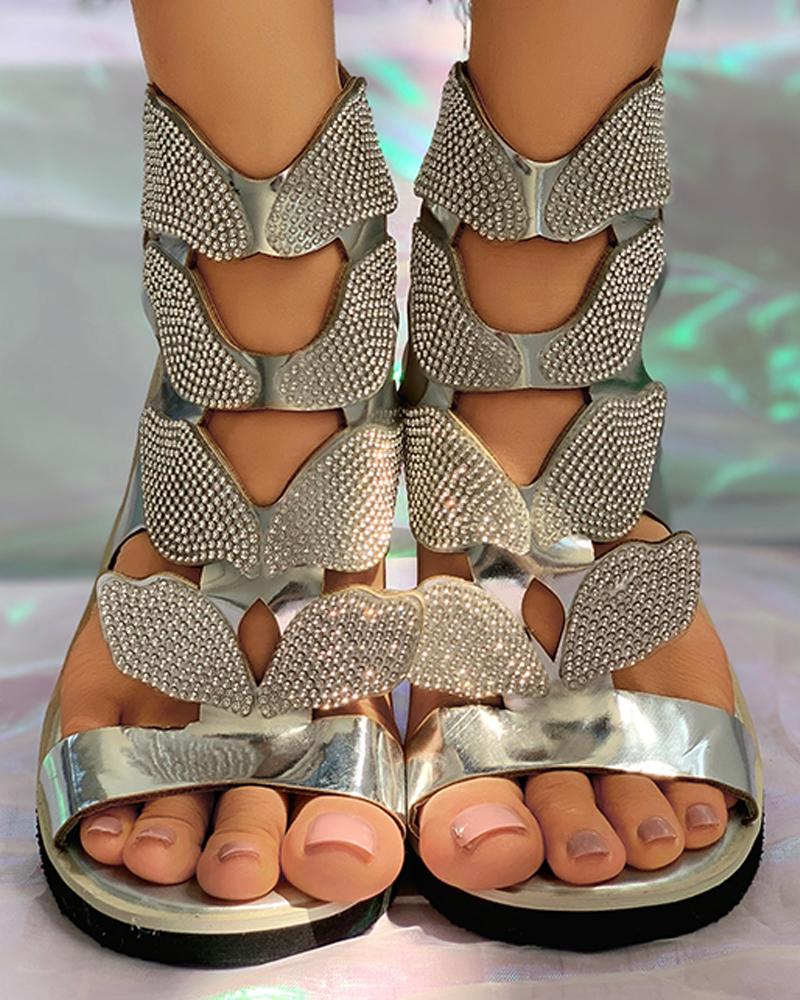 Butterfly Pattern Rhinstone Cutout Flat Sandals, Silver