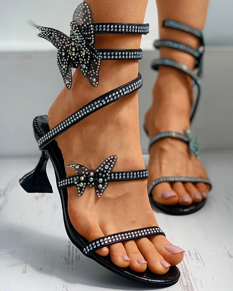 Butterfly Pattern Studded Open Toe Pyramid Heel, Black