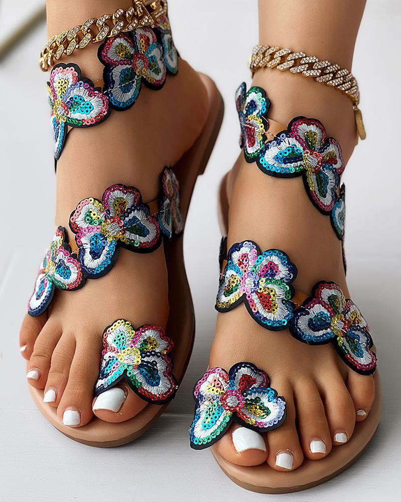 Butterfly Pattern Toe Ring Slingback Beach Sandals, Multicolor