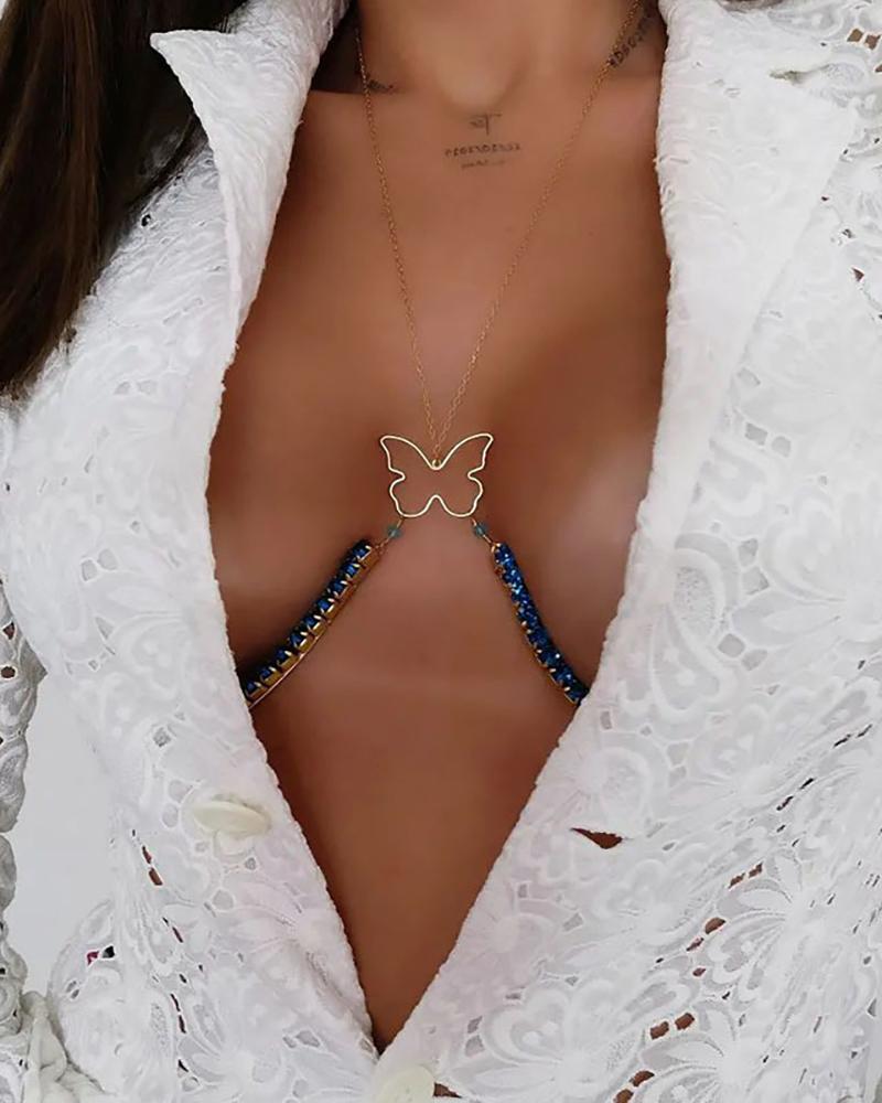 Butterfly Shaped Pattern Rhinestone Bra Body Chain, Gold