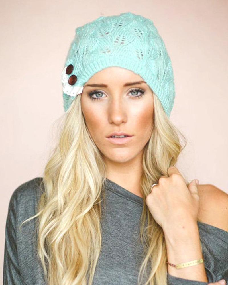 Button Decor Lace Patch Hollow Out Knit Beret, Blue