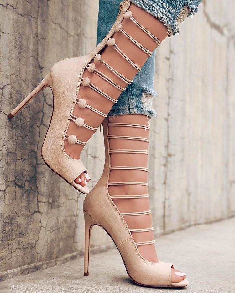 Button Design Peep-toe Zipper Back High Heeled Sandals, Red