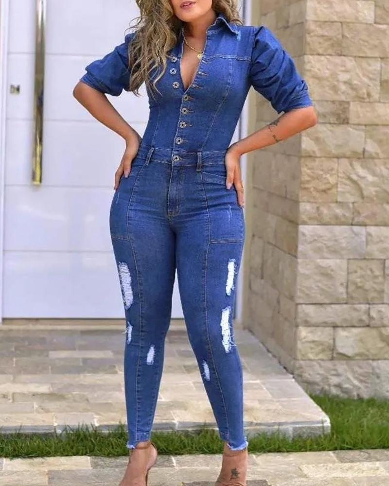 Button Design Puff Sleeve Ripped Denim Jumpsuit, Blue