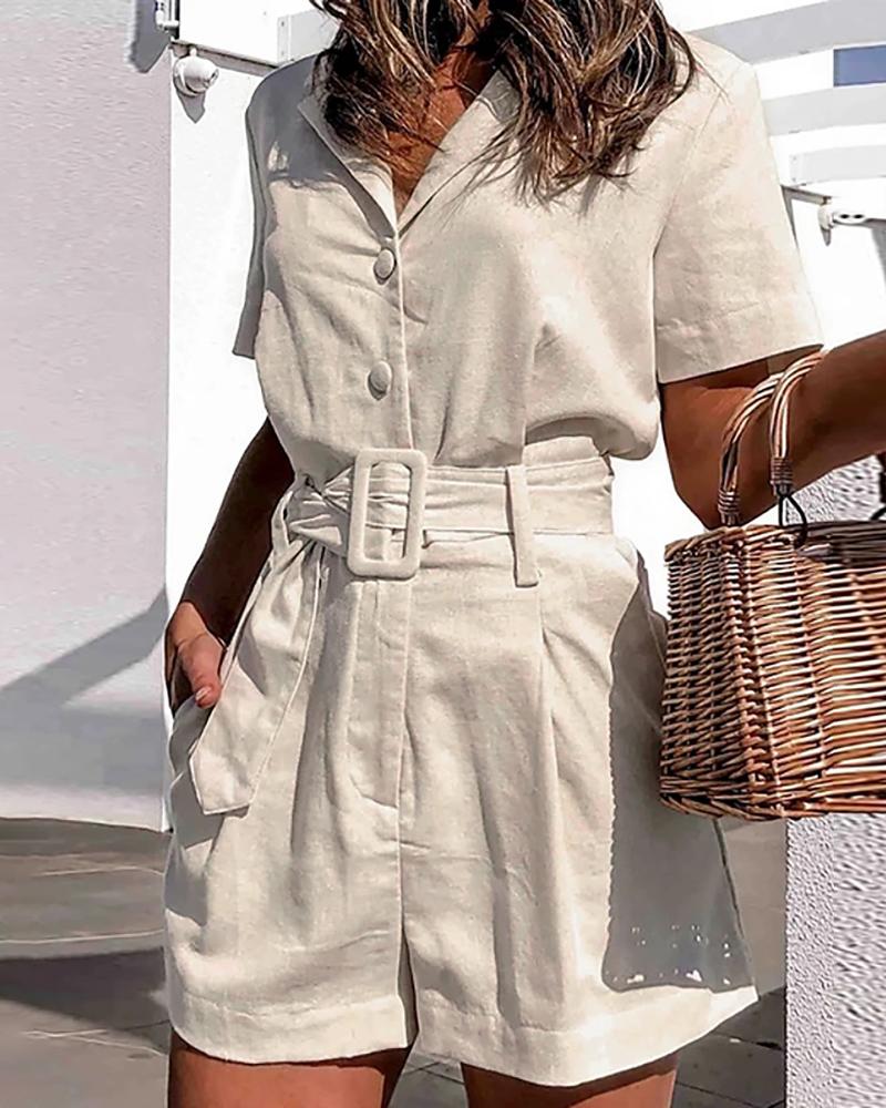 Button Design Short Sleeve Belted Cargo Romper, White