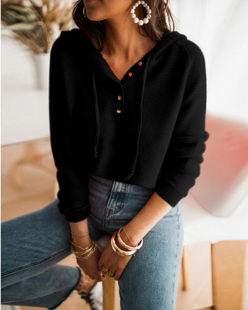 Button Front Drawstring Hooded Sweater, Black