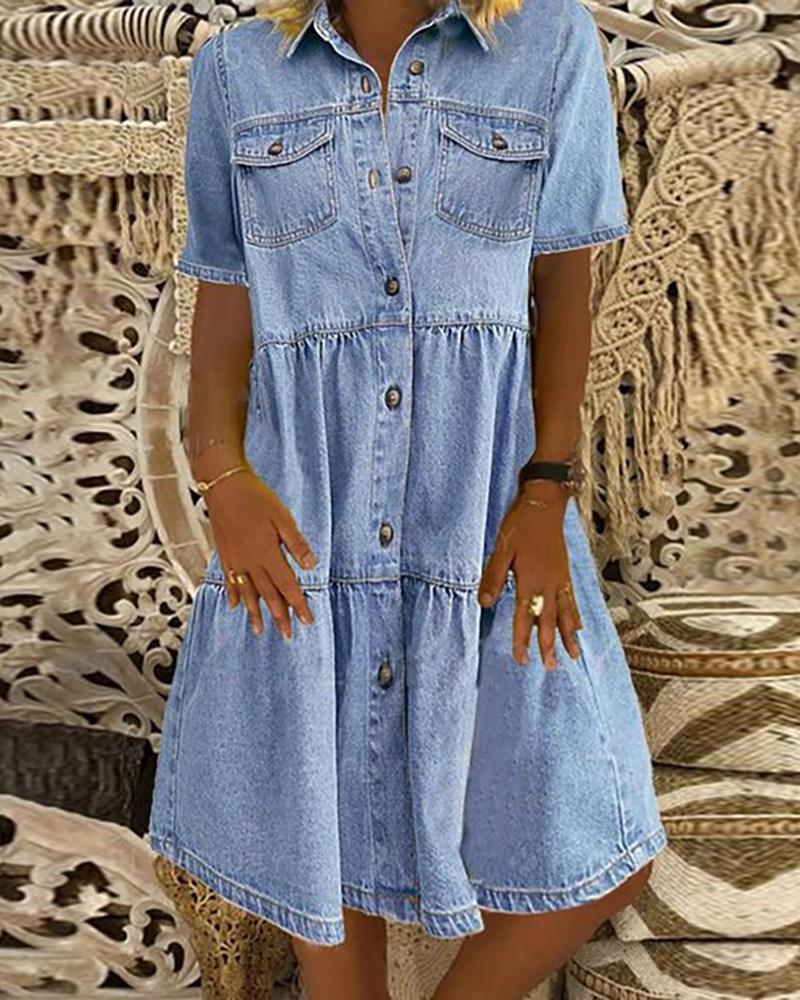 Button Front Pocket Design Ruched Denim Dress, Light blue