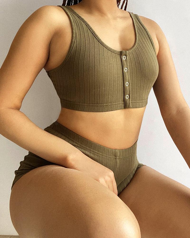 Button Front Ribbed Crop Top & Shorts Set, Brown