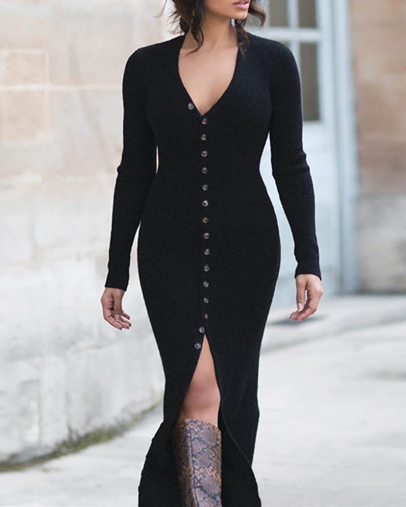 Button-down Slit Ribbed Midi Dress, Black