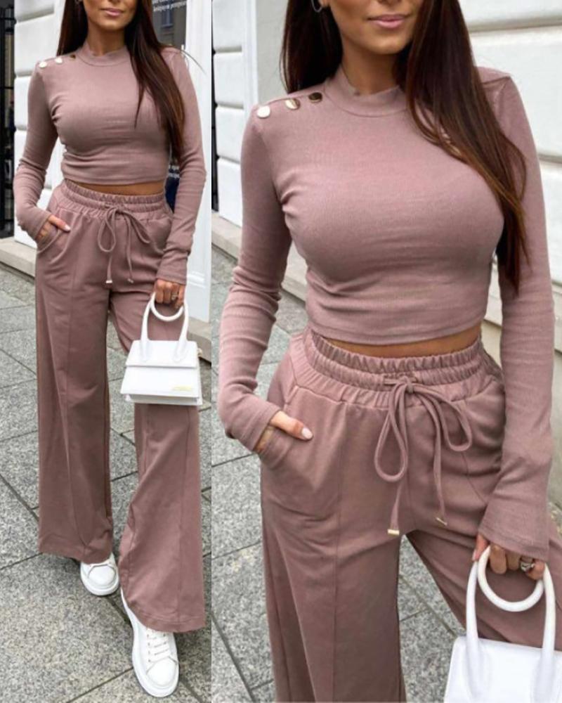 Buttoned Crop Top & Drawstring Wide Leg Pants Set, Red bean