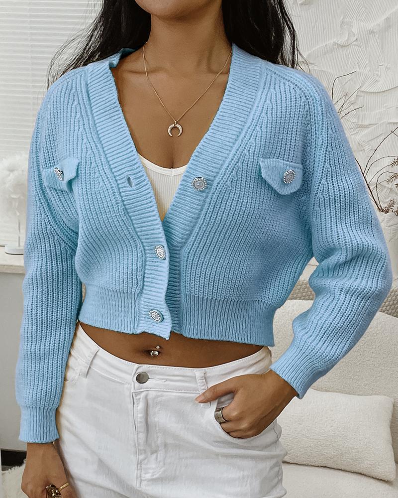Buttoned Fake Pocket Crop Cardigan, Blue