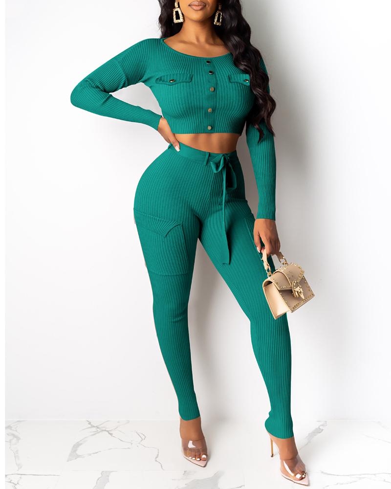 Buttoned Ribbed Pocket Crop Top & Drawstring Pants Sets, Green