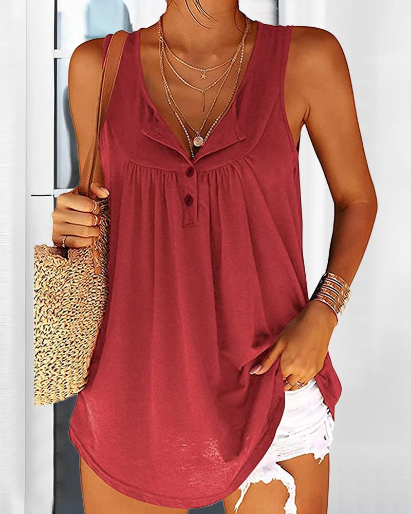Buttoned Ruched Round Neck Flowy Tank Top, Red