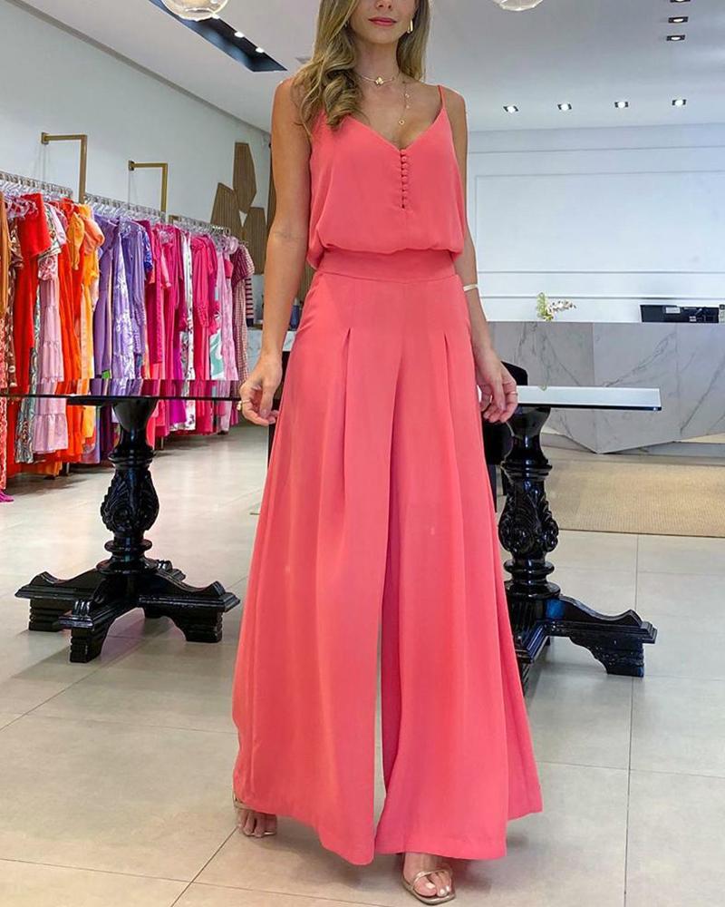 Buttoned Ruched Slit Cami Top & Flared Pants Set, Hot pink