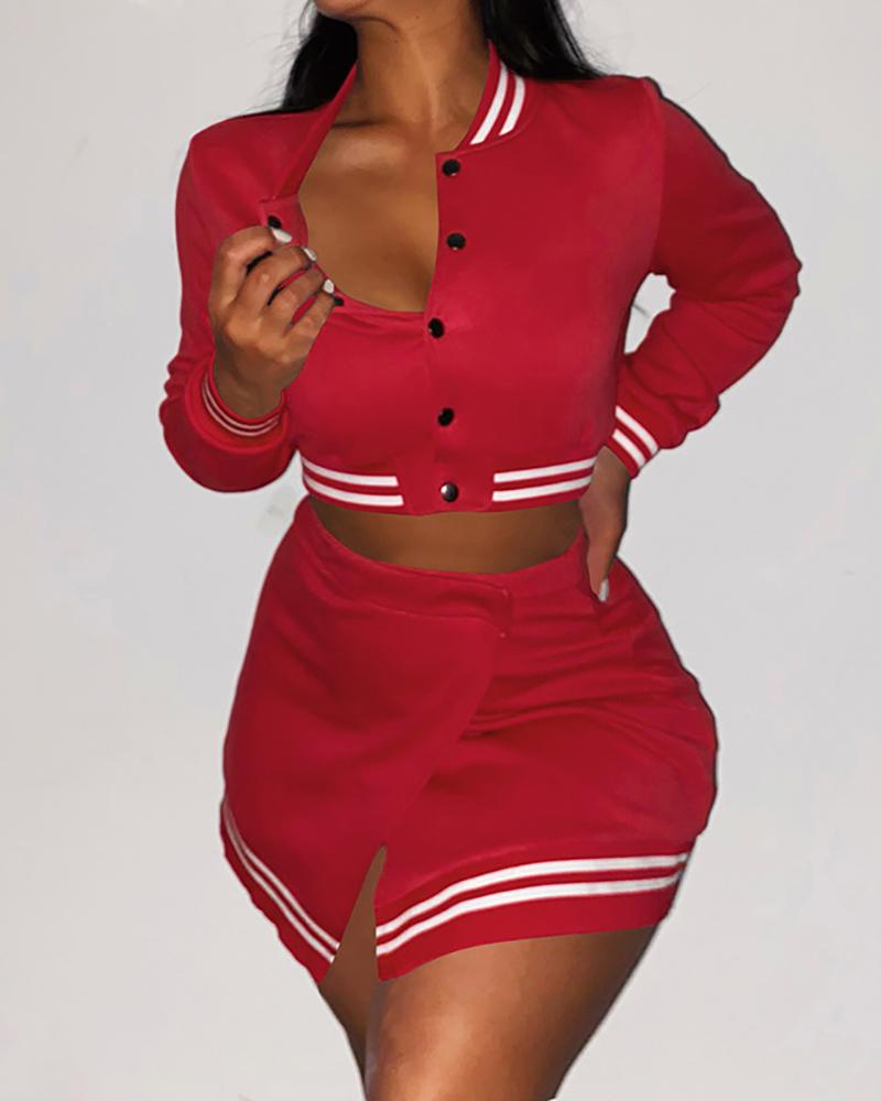 Buttoned Striped Baseball Jacket & Slit Skirt Set, Red