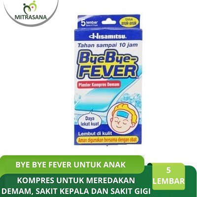 Kegunaan▪ Demam ▪ Sakit kepala ▪ Sakit gigi ▪ Cuaca panasKeunggulan dari ByeBye-FEVER™ Anak :▪ Digunakan untuk usia diatas 2 tahun.▪ Efek dingin bekerja sampai 10 jam.▪ Lembut dan tidak mengiritasi kulit.▪ Daya lekat kuat.▪ Aman digunakan bersama dengan obat lain.Aturan Pakai▪ Bersihkan kulit sebelum pemakaian.▪ Lepaskan lapisan plastik dan tempelkan permukaan yang melekat pada daerah yang diinginkan.