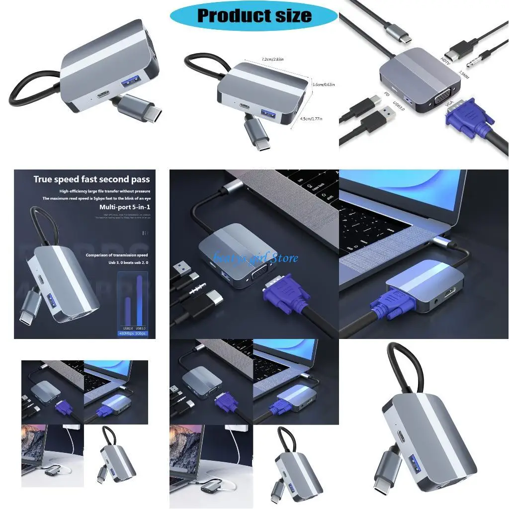 C7AB USB C Adapter Docking Station 3.5mm VGA HDTV USB3.0 Data Transfer Adapter