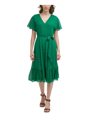CALVIN KLEIN Женское зеленое платье миди с расклешенными рукавами и пуговицами с поясом и поясом, Зеленый