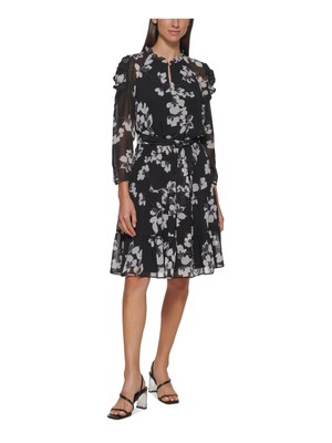 CALVIN KLEIN Женское черное платье с поясом и длинными рукавами на подкладке + расклешенное платье, Черный