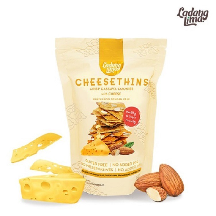 Cheesethin Cookies baru dari Ladang Lima. Perpaduan taburan almond, keju, dan serpihan kelapa yang memberikan rasa gurih dan renyah, menjadikan cheesethin sebagai pilihan kukis krispi yang lezat bebas gluten, sehat, dan bikin hari-hari ngemilmu makin seru.