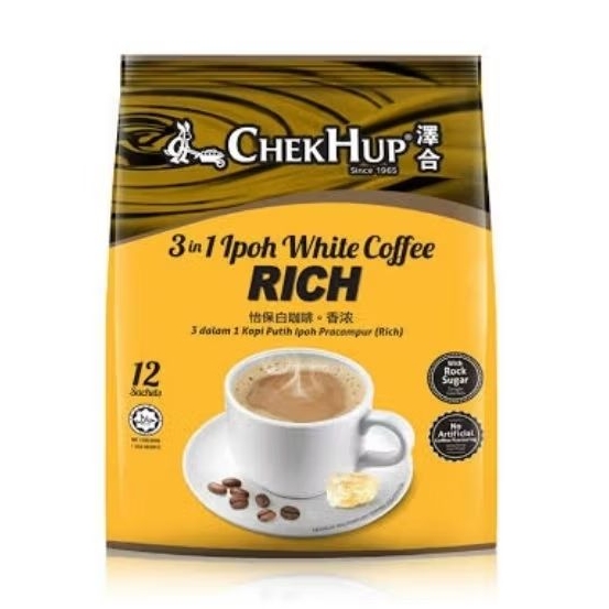 Chek Hup 3in1 Ipoh White Coffee RICH adalah gabungan kopi Arabica dan Robusta yang diracik sehingga menghasilkan kopi dengan rasa seimbang dan sempurna. Gula yang dipakai adalah Gula Batu yang diproduksi sendiri.