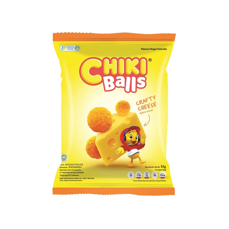 Chiki balls cemilan gurih dan renyang yang mengandung komposisi Jagung, minyak olein kelapa sawit, beras, bumbu, garam, gula, keju bubuk, penguat rasa mononatrium glutamat, dinatrium guanilat dan dinatrium inosinat, pewarna makanan.