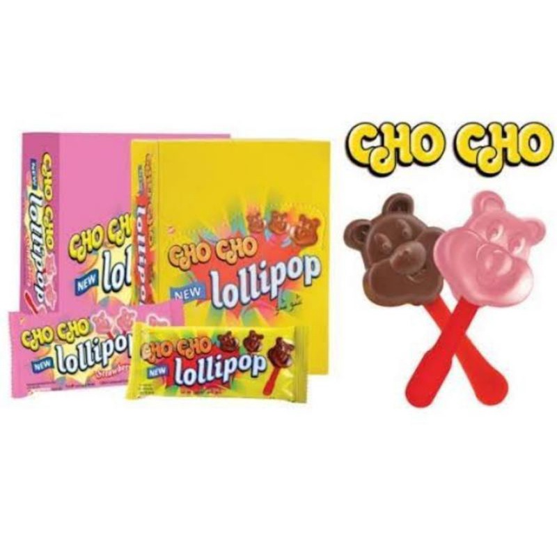 Cho cho lolipop tersedia 2 rasa,,,coklat dan sttoberi, di jual per kotak isi 24 pcs,,,,yuk di order