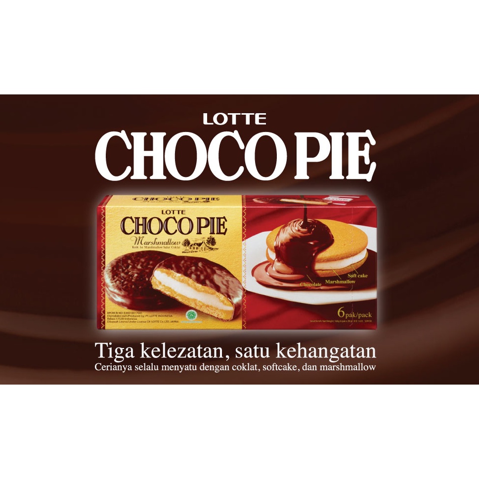 Nikmati kelezatan Lotte Choco Pie dari kombinasi Chocolate yang berkualitas, Softcake yang lembut dan Marshmallow yang fluffy di setiap gigitannya. Snack yang pas untuk dinikmati bersama dengan keluarga anda. Lotte Choco Pie mempersembahkan Tiga Kelezatan dalam Satu Kehangatan.