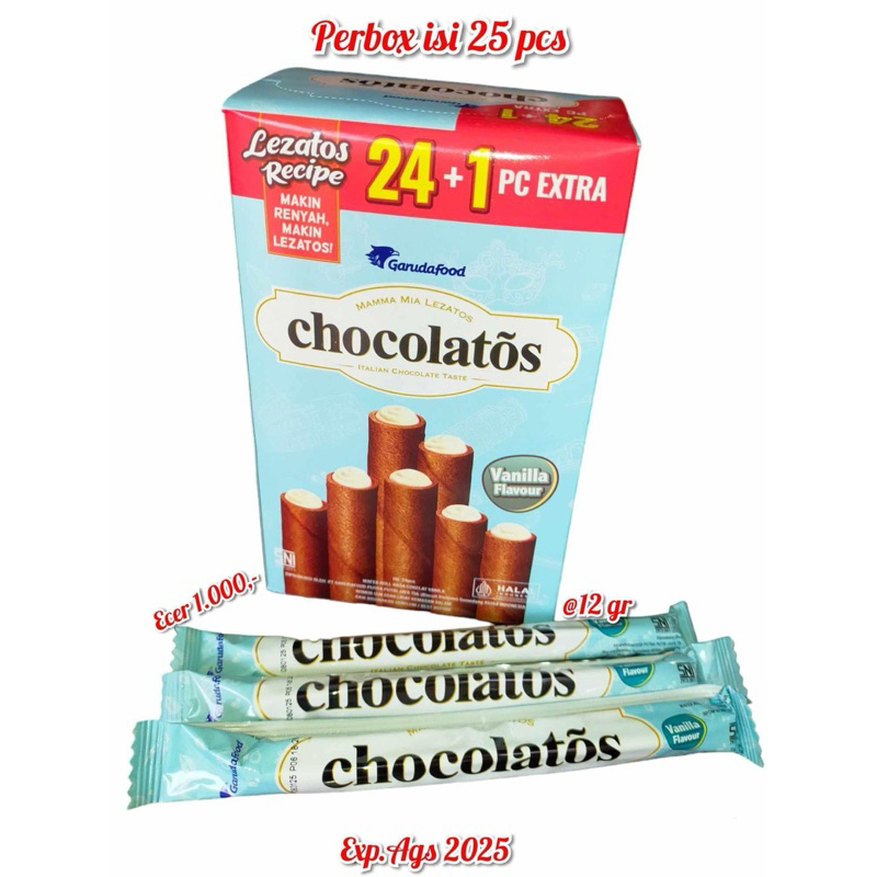 Chocolatos Wafer Roll merupakan wafer roll isi vanilla dgn kelezatan ala Italia.