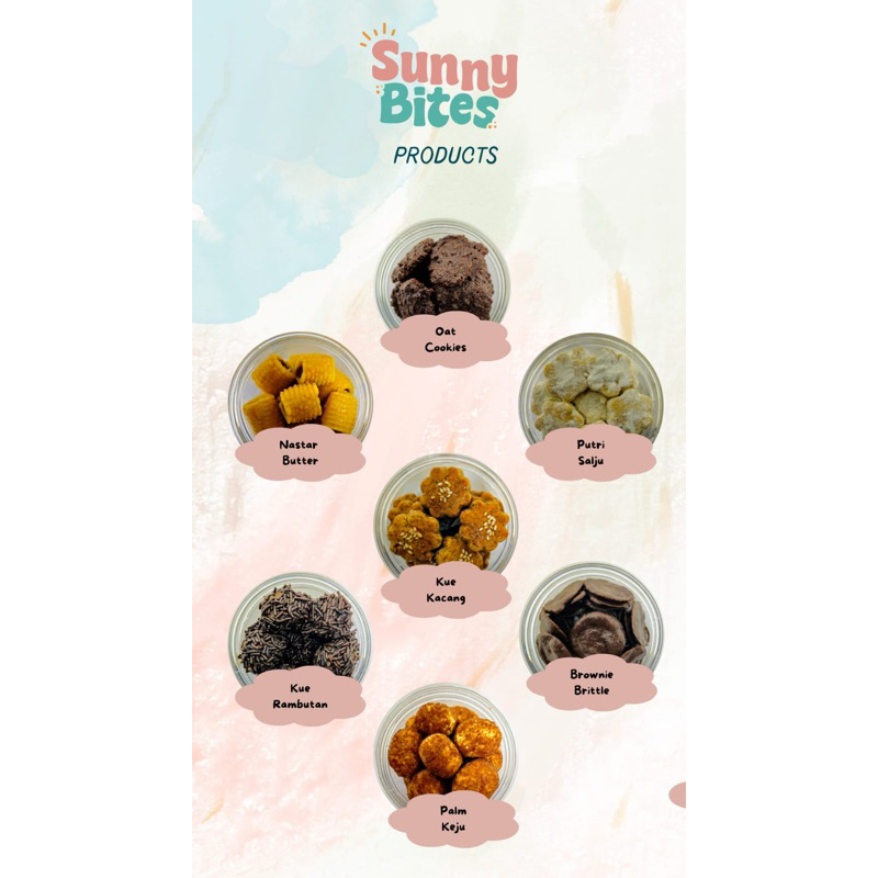 Sunny Bites adalah kue kering yang renyah dan lezat, dengan rasa yang manis dan gurih. Dibuat dengan bahan-bahan berkualitas tinggi dan diproses dengan cinta, Sunny Bites siap menjadi teman Anda dalam berbagai kesempatan!