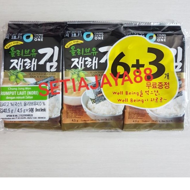 CHUNG JUNG ONE SEAWED 6+3 NORI OLIVE OIL/RUMPUT LAUT MINYAK ZAITUN