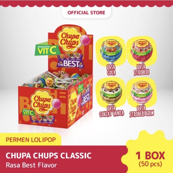 1 BOX Chupa Chups Best Flavour berisikan lolipop Chupa Chups dengan berbagai varian rasa.