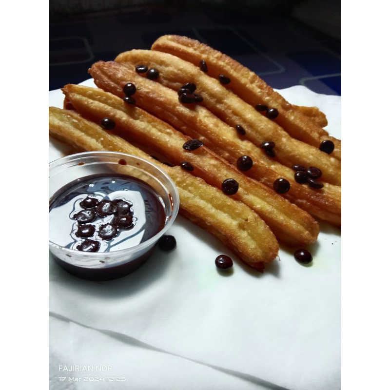 churros jutos dengan toping chococip yang mana rasanya yang lezat dan juga dengan perpaduan cocolan coklat yang nikmat sehingga pas di mulut