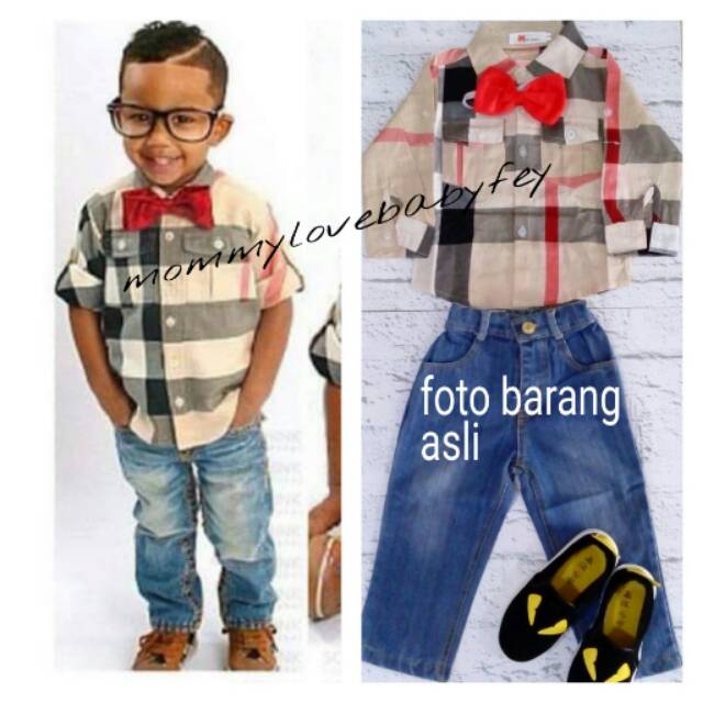 Setelana anak cowo terdiri dari kemeja + dasi + celana jeans pinggang karet