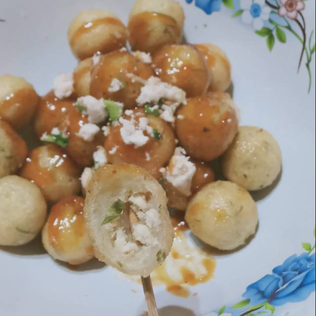 cilok goreng dengan isian cincang ayam disajikan dengan saos pedas dan topping cincang ayam