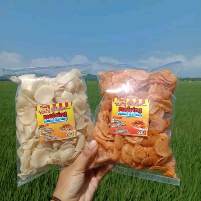cimol kering yg di goreng garing dan sangat renyah awet krispinya dan produksi sendiri lgsg di goreng pda saat itu juga,halal NO pengawet