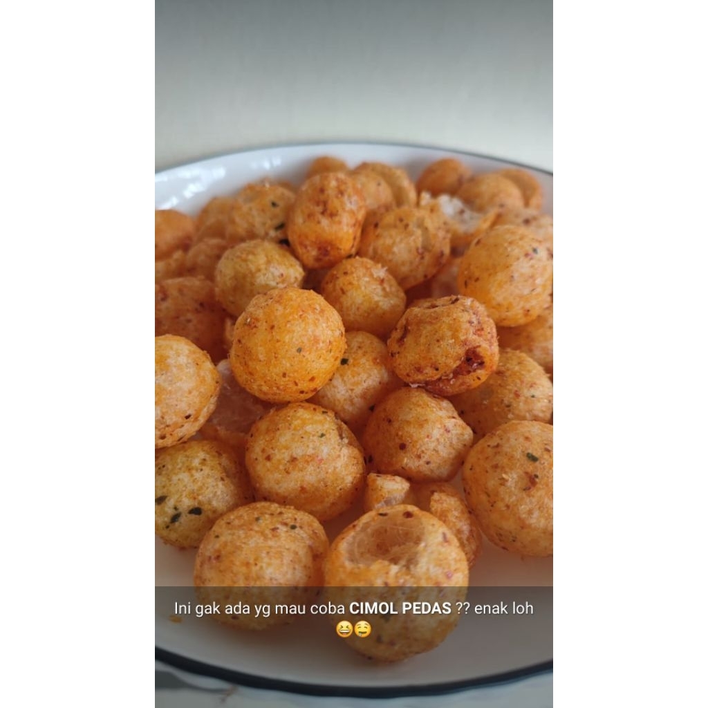 Cimol pedas daun jeruk yang terbuat dari sari pati tepung singkong yg diolah secara higienis dan memiliki cita rasa yang nikmat dan lezat dan pasti nya bikin kamu ketagihan untuk mencicipi nya lagi dan lagi