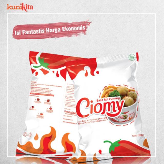 Satu cup ciomy terdiri dari: baso aci, tahu kering, siomay kering, d'tella hot, bumbu, cabai, bumbu kacang, minyak ebi, jeruk limau dan juga ada tambahan MIE SO'UN.