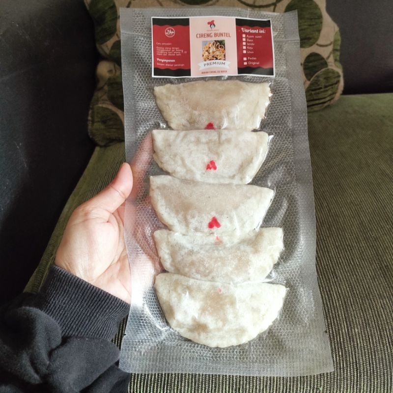 cireng isi usus pedas ukuran besar 10cm sudah digoreng setengah matang dan bisa digoreng kembali saat ingin disajikan.goreng dengan menggunakan api sedang selama 7-10menit rasanya gurih enak dan lembut