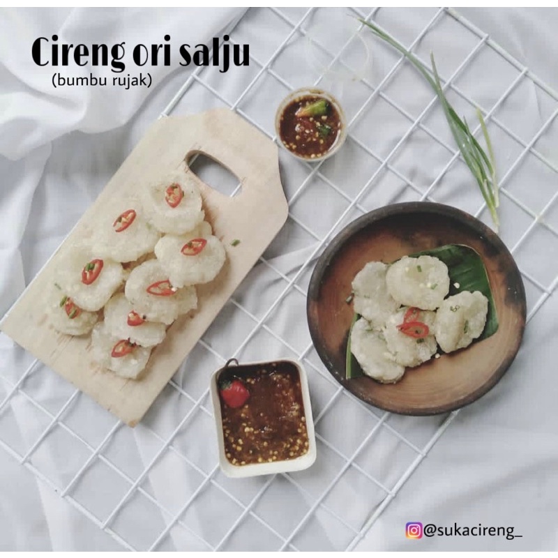 Cireng ori salju yang berbahan dasar tepung aci pilihan dengan saus rujak dari bahan dasar pilihan.