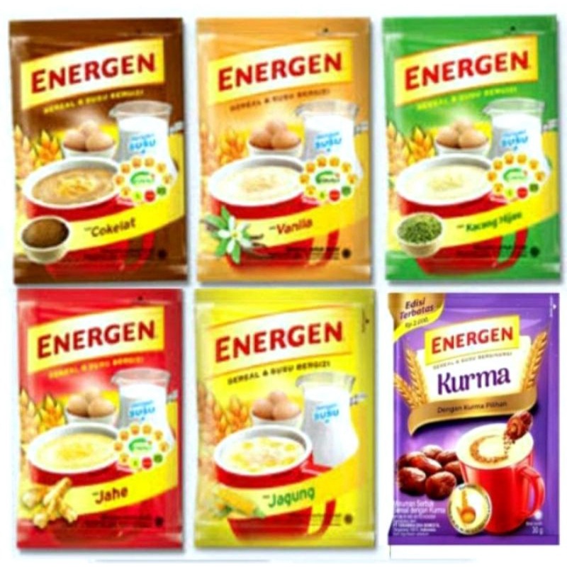 Energen adalah minuman susu dan serial yang cocok untuk menghilangkan rasa lapar minuman ini juga mengandung karbohidrat,paduan vitamin,mineral dan protein yang dibutuhkan tubuh dalam komposisi yg tepat .Rasanya ada beberapa macam variasi Rasa antara lian;