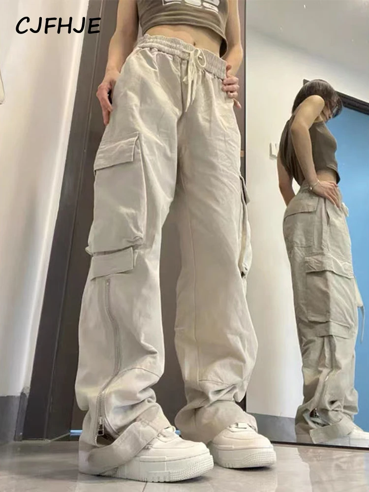 CJFHJE Брюки-карго женские с боковыми карманами бежевые мешковатые Прямые повседневные черные брюки с завышенной талией на молнии Y2k