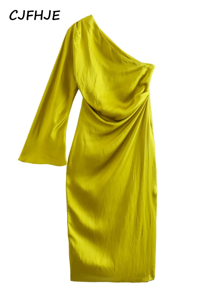 CJFHJE Элегантное желтое асимметричное платье с одним рукавом, элегантное женское летнее платье-миди, длинное платье с открытыми плечами для женщин