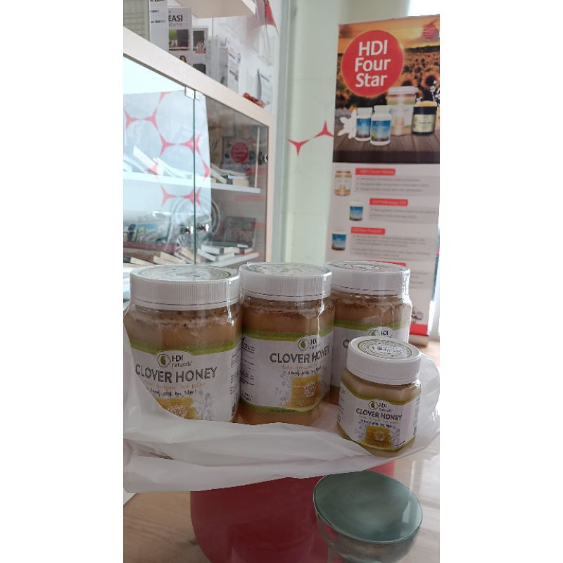 *HD Clover Honey berasal dari bunga clover yang dinyatakan sebagai madu terbaik oleh peternak lebah di seluruh dunia. Rasanya enak dan teksturnya sangat lembut. *Kebanyakan madu yang dijual saat ini, diproses dengan pemanasan sehingga dapat merusak enzim yang terkandung didalamnya, dan juga mengalami penyaringan untuk mendapatkan tampilan yang jernih. Semua proses tersebut dapat menyebabkan madu kehilangan kandungan nutrisinya sehingga kualitasnya pun akan menurun. HDI Clover Honey merupakan madu murni dan alami, tanpa melalui proses pemansan ataupun penyaringan, kaya akan kandungan enzim dan nutrisi yang tinggi. *Kandungan airnya rendah sehingga tidak mudah terjadi fermentasi atau berjamur yang mana dapat menurunkan kualitas nutrisinya. *HDI Clover Honey juga mengandung royal jelly (warna putih seperti susu pada permukaan) dan bee pollen (berbentuk butiran kecil) yang menjadikannya kaya akan nutrisi!