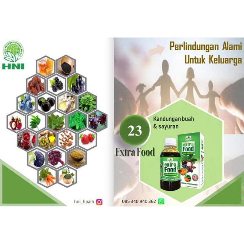 EXTRA FOOD, adalah makanan kesehatan alami yang dibuat dari sinergi 23 herbal buah-buahan dan sayuran yang kaya akan antioksidan dan serat alami.