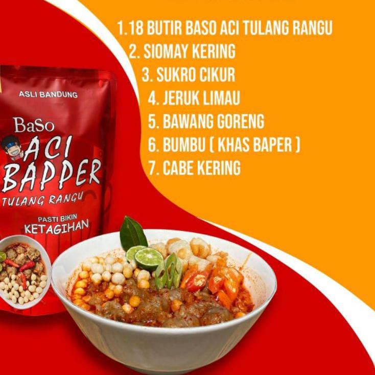 Baso Aci instant dengan tulang rangu dan bumbu lengkap tinggal seduh. 100% Daging Sapi. Tersedia pelengkap seperti siomay, bawang goreng, sukro, dan cabe bubuk didalamnya