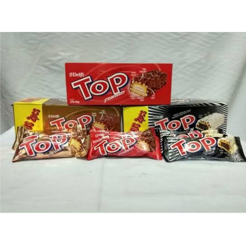 Coklat top tersedia 3 varian rasa, black & white, stroberi , coklat, double coklat,,,di jual per 1 box isi 24 pcs harga murah, enak rasanya ,,,yu di order