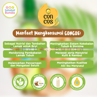 Concos Virgin Coconut Oil Kids ( minyak kelapa murni 100% ) adalah minyak kelapa murni dengan kandungan utama asam laurat yang memiliki sifat antibiotik, anti bakteri dan jamur. Metode esktraksi consos adalah cold pressesed dan tanpa pemanasan ataupun tambahan kimia.